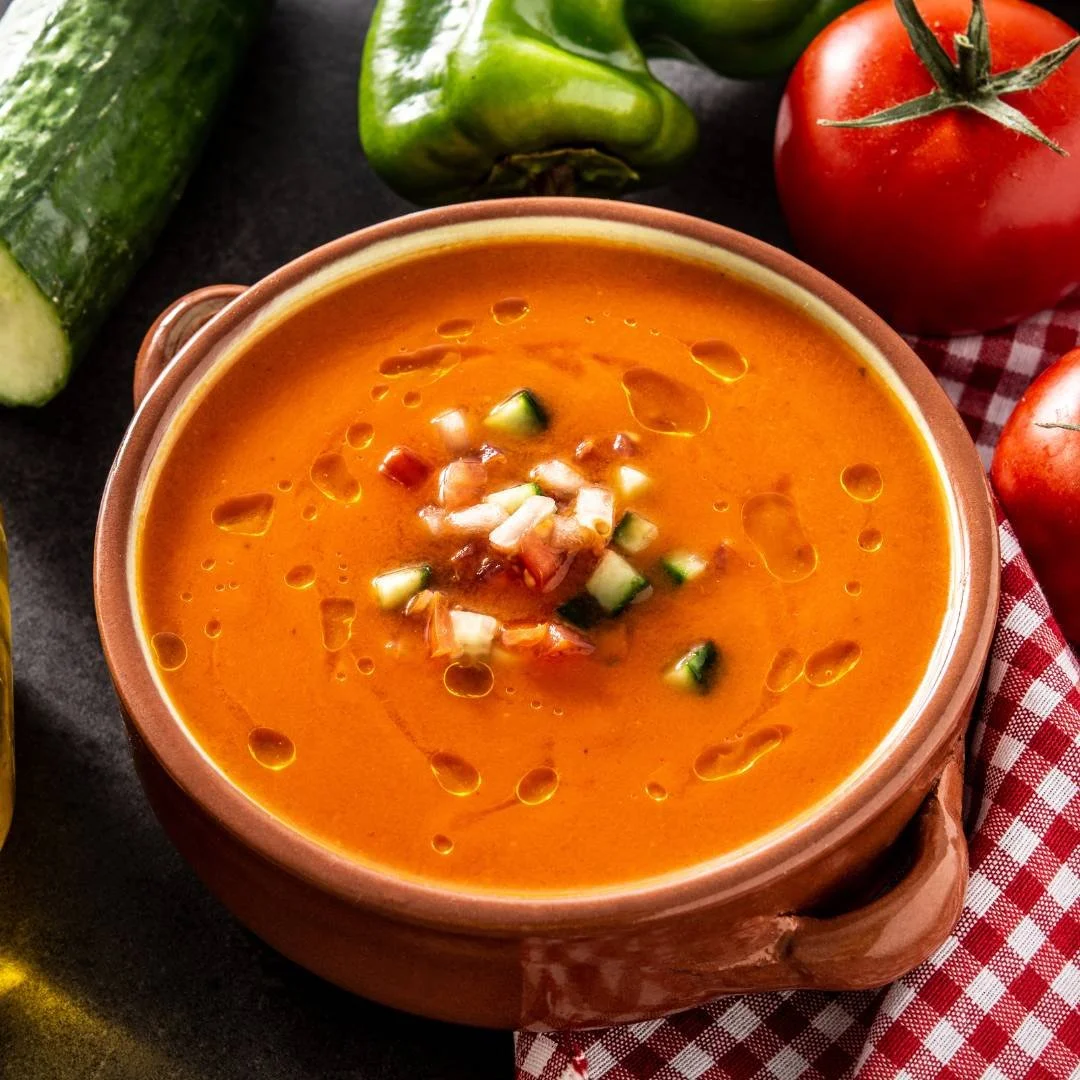 Add cucumber, tomatoes, peppers, onion, garlic, cilantro, vinegar, olive oil, salt, and pepper into a food processor or soup blender